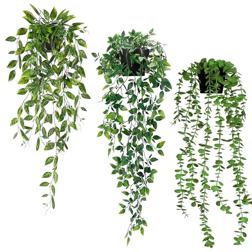 INSANYJ konstgjord hängande växt, 3 stycken konstgjorda växter hängande med krukor konstgjorda växter eukalyptusblad 63 cm lång, plastväxt dekoration modern vardagsrum balkong sovrum rum