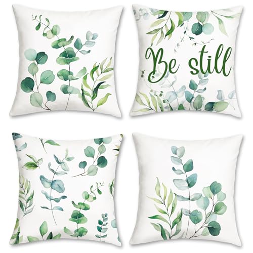 Bonhause eukalyptusblad kuddfodral 45 x 45 set med 4 akvarell salvia gröna blad växter vår sommar dekorativa örngott mjuk sammet utomhus för soffa bil sovrum heminredning