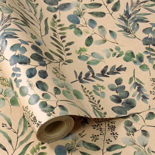 Ruspepa Presentpapper med eukalyptusblad, 43 cm x 10 m, minirulle, kraftpapper, inslagningspapper, rulle för kvinnor, vår, sommar, bröllop och födelsedag