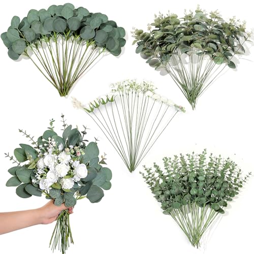 110 st 7 typer blandade konstgjorda eukalyptusstjälkar och fuskblommor, falska silverdollar eukalyptusblad stjälkar bulk äkta touch bladgrenar för gör-det-själv-buketter blomsterarrangemang bröllop