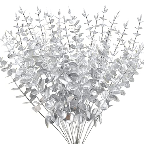 FEQO 36 st silver eukalyptusstjälkar konstgjorda eukalyptusblad dekor eukalyptusgrenar falska eukalyptus med falska löv 38 cm falsk eukalyptusstam för vas bröllopsbukett hem (FF-22-070)