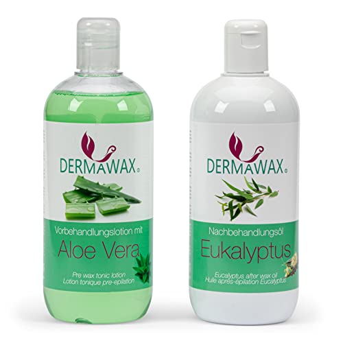 Dermawax För- och efterbehandlingsset 2 x 500 ml — Aloe Vera Lotion från hårborttagning + eukalyptusolja vård efteråt — avlägsnar vaxrester, lugnar och skyddar huden