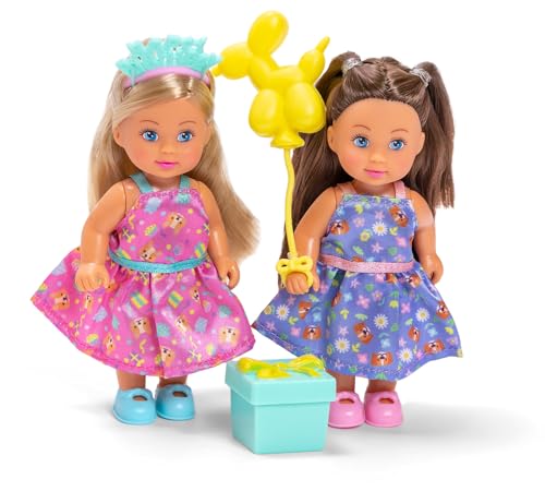 Simba Evi Love Birthday Party – Två Evi dockor i födelsedagsklänning med diadem, ballong och presentförpackning med överraskning, 12 cm stor, dockset för barn från 3 år