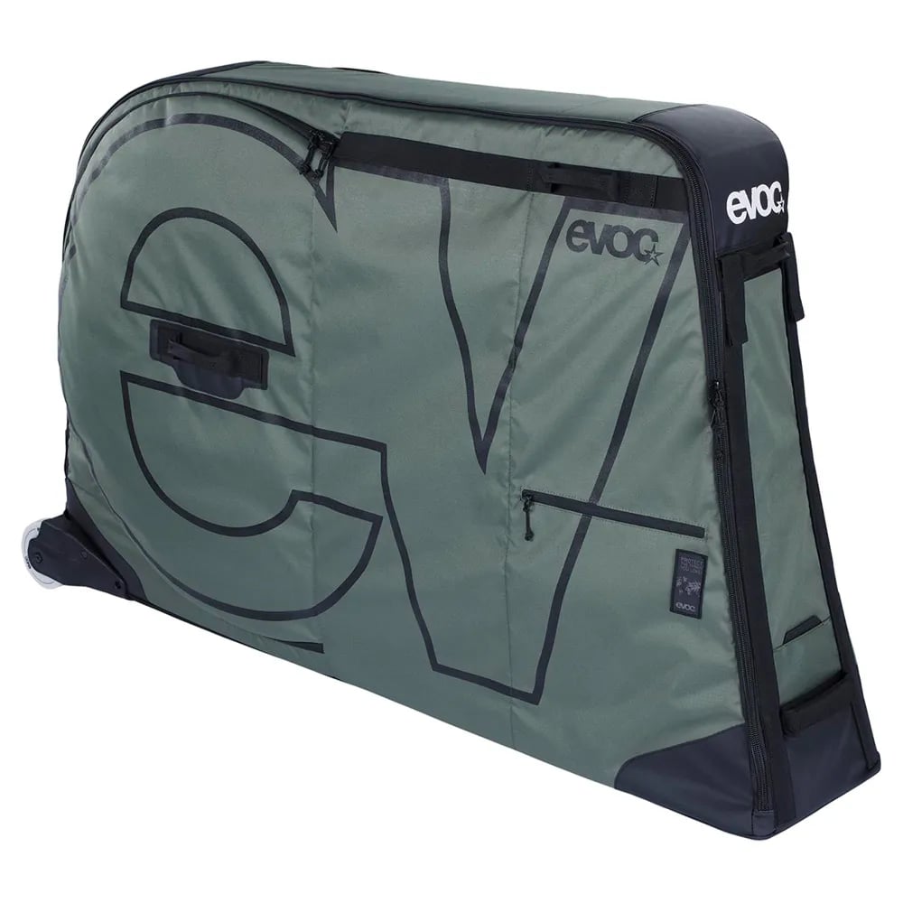EVOC BIKE BAG lätt cykeltransportväska (cykelväska med hjul för racer-, gravel-, XC-, FR-, enduro-, DH-, ≤29"-cyklar; med BIKE BLOCK för stabilt stöd; max. hjulbas 126 cm), mörk olivgrön