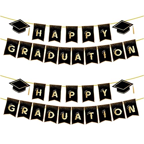 SKHAOVS 2 delar glad examen flaggväv examen bakgrundsbanderoll för högskola skola gratulationer examensfest dekorationer svart gyllene grad hatt papper girlang fotobås rekvisita (svart)