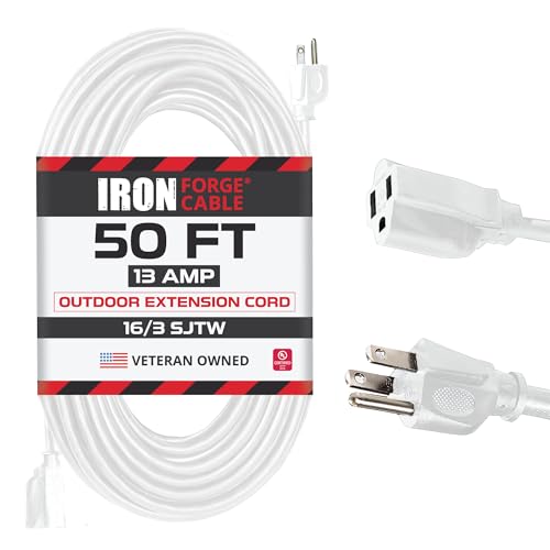 White Outdoor Extension Cord 50 Ft with 3 prongs Electrical Power Outlets - 16/3 SJTW, 13 AMP Heavy Duty White Power Cord for Lawn, Garden, Appliance, 16 Gauge Extension Cord