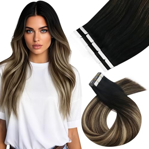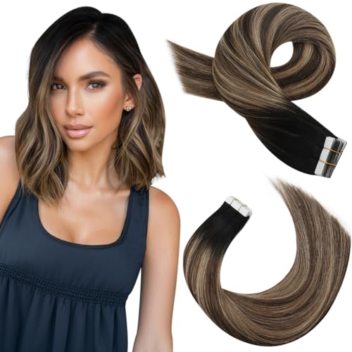 Moresoo Tape Extensions äkta hår, 20 stycken, 30 g, osynliga tejpförlängningar, #1B/4/14, svart till mörkbrun med guldbrun, 30 cm, mode, slätt hår, silkeslent mjuk