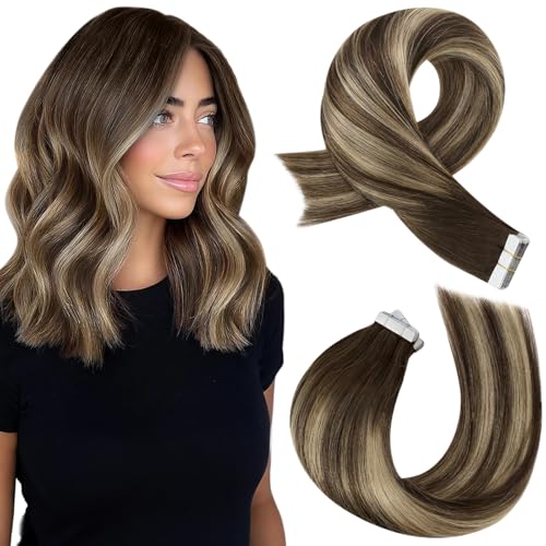 Moresoo Tape in Extensions äkta hår 60 cm Balayage Tape Extensions äkta hår mörkbrun med karamellblond tejp i hårförlängningar, hårförlängning #P4/27, 50 g, 20 st
