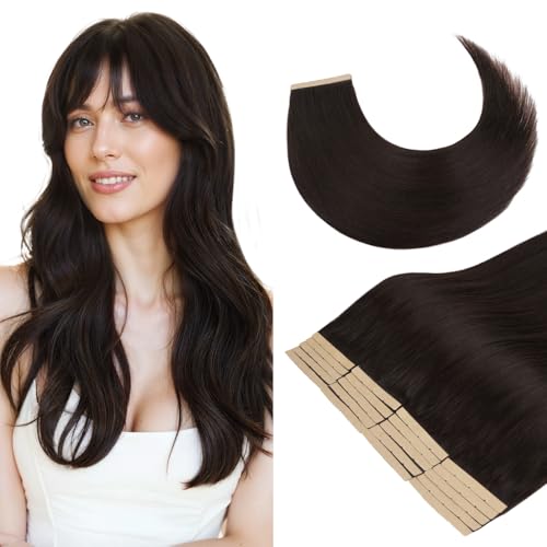 SUYYA Tape Extensions äkta hår, osynlig tejp i förlängningar, äkta hår, sidenlen rak Remy Tape hårförlängningar äkta människohår 65 cm 20 stycken 60 g #2 mörkbrun