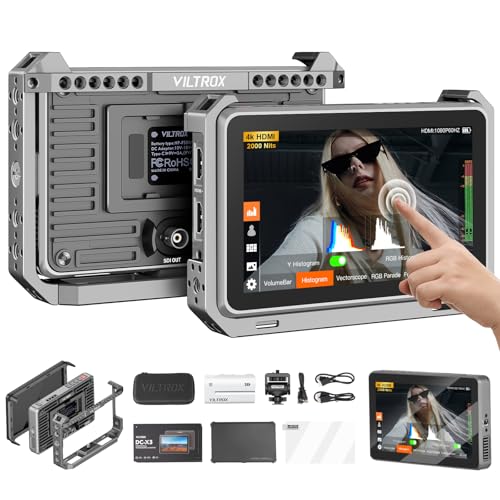 VILTROX DC-550 PRO 5,5 tums pekskärm videoskärm – 1200nits 4K HDMI DSLR extern skärm med exponeringsfokus hjälp vågform för Sony Canon Nikon med batteri