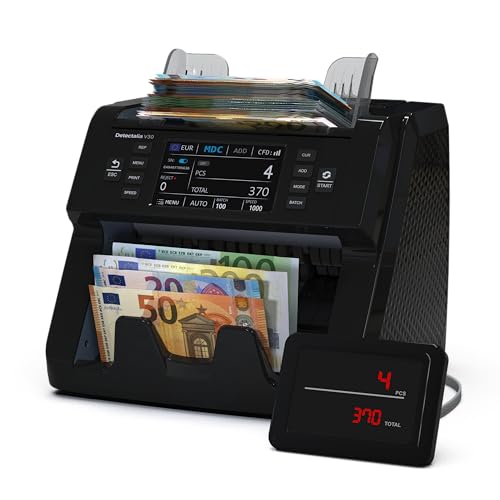 Detectalia V30 sedelräknare och förfalskningsdetektor med dubbel CIS, 4,5 tums pekskärm + extern skärm, serienummerläsning, multi-valuta blandad räkning, 1 200 anteckningar/minuter, USB