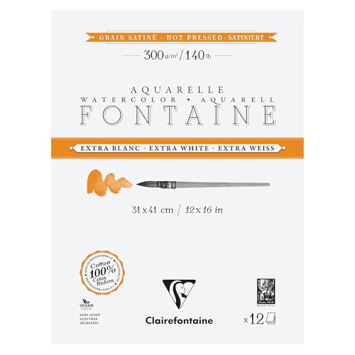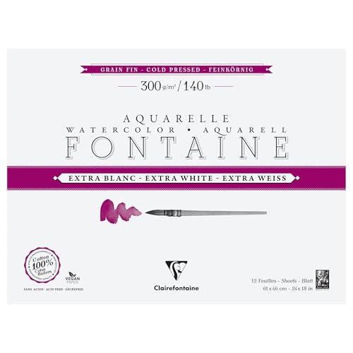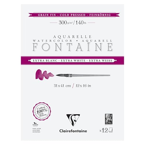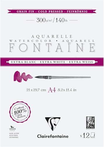 Clairefontaine 976022C 4 sidor extra vitt fontän limmat block - 12 ark extra vitt akvarellpapper 100% satinkorn i bomull - professionell kvalitet 31 x 41 cm 300 g