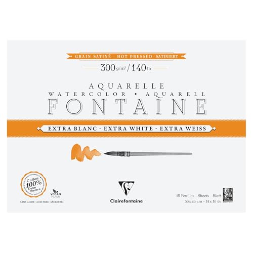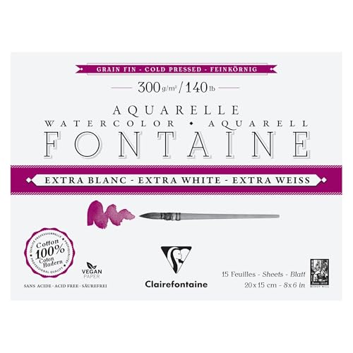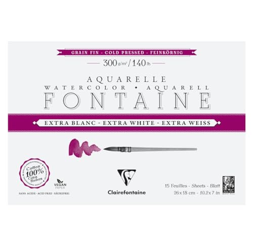 Clairefontaine 976039C 4 sidor extra vitt fontän limmat block - 15 ark extra vitt akvarellpapper 100% finkornig bomull - professionell kvalitet 26 x 18 cm 300 g