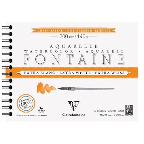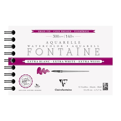 Clairefontaine 976030C Extra vit fontän spiralformat album - 12 ark extra vitt akvarellpapper 100% satin bomull - professionell kvalitet 18 x 24 cm 300 g