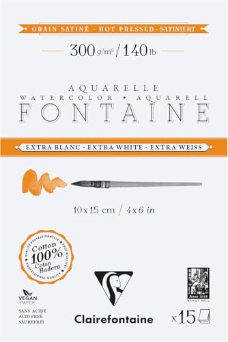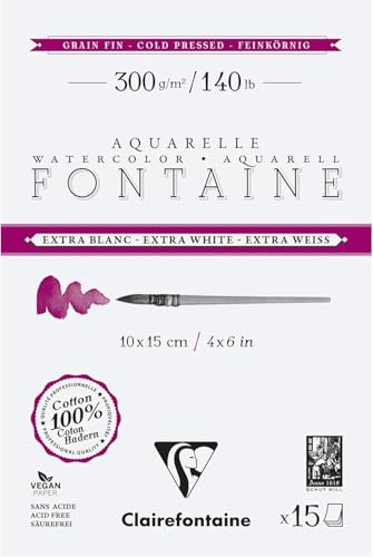 Clairefontaine 976017C 4 sidor extra vitt fontän limmat block - 15 ark extra vitt akvarellpapper 100% satinkorn i bomull - professionell kvalitet 10 x 15 cm 300 g