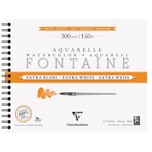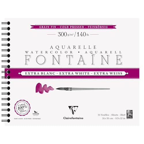 Clairefontaine 976031C Extra vit fontän spiralformat album - 12 ark extra vitt akvarellpapper 100% satin bomull - professionell kvalitet 24 x 30 cm 300 g
