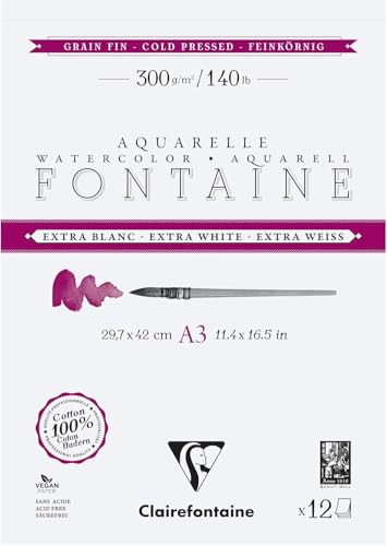 Clairefontaine 976048C 2 sidor extra vitt fontän limmat block - 12 ark extra vitt akvarellpapper 100% finkornig bomull - professionell kvalitet A3 300 g