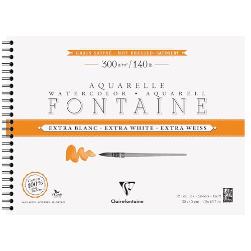 Clairefontaine 976032C Extra vit fontän spiralformat album - 12 ark extra vitt akvarellpapper 100% satin bomull - professionell kvalitet 30 x 40 cm 300 g