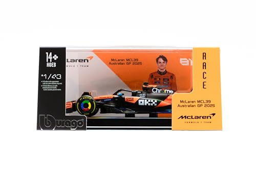 Bburago - McLaren F1 MCL39 2025#81 Piastri, diecast-bil i skala 1:43 med vitrin, detaljerad replika av F1 McLaren, bas ingår, officiellt licensierad, rekommenderad ålder 14+ år