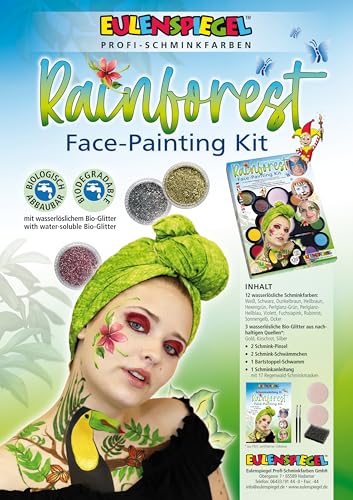 Eulenspiegel 212097 - Rainforest Face sminkpalett, 12 professionella vattenfärger, 3 glitter, 2 svampar, 1 skäggstubbsvamp, 2 penslar, 1 sminkguide