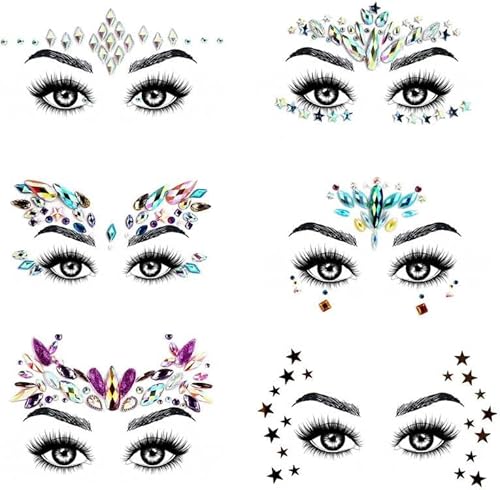 SHINEYES Music Festival Ansikte juveler, Rhinestone Rave Face Gems Glitter, Crystal Födelsedagsfest Festival Ansikteklistermärke, Ögon Ansikte Kropp Tillfälliga Tatueringar för Festival Party (6 Pcs No.06)