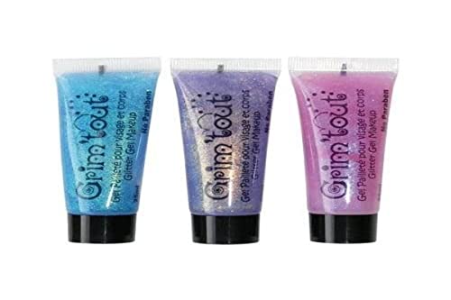 GRIM'TOUT Set med 3 Face Glitter Gel Tubes - Rosa, Mauve, Turkos 25 ml - Vattenbaserad smink för barn - Parabenfri - Lätt att applicera och rengöra - Kreativ fritid - Karneval, fester