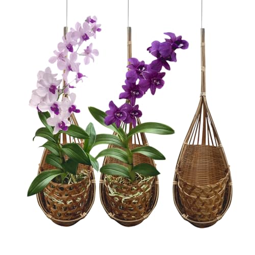 PANWA Handgjord 100% thailändsk bambuvävd 10 cm hängande orkidékorg – uppsättning av 3 multifunktionella fågelbo-stilar växthängare för lusthus – inomhus/utomhus blomplanterare (naturligt brun)