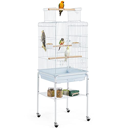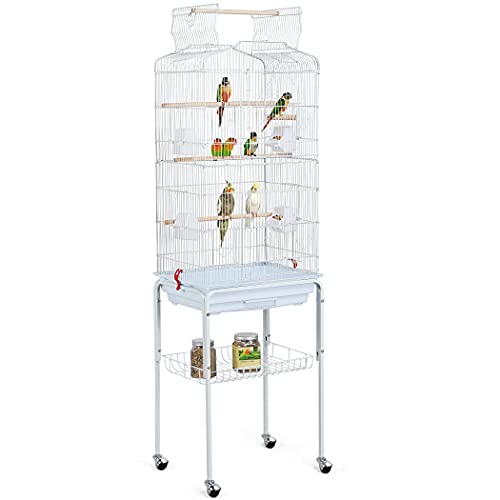 Yaheetech Fågelbur med stativ, fågelvoljärer med 3 trästänger och 4 matskålar, undulat bur med 4 rullar, voljär för papegojor, 52 x 79 x 132 cm, vit