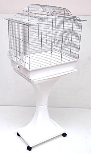 Fågelbur - På hjul - 50x49x137 cm - Utdragbar bottenbricka - Foderskålar - Stål, trä - Vit