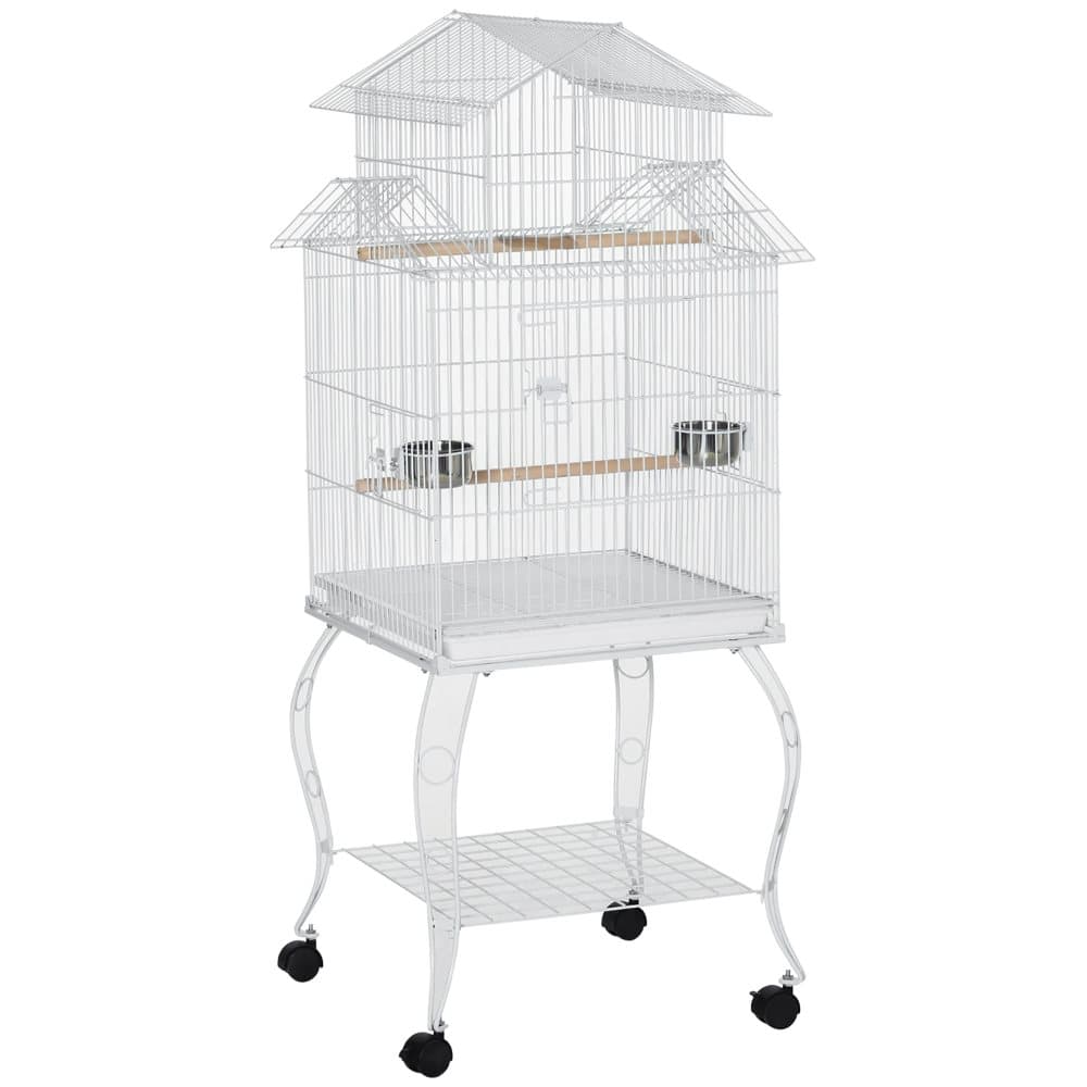 PawHut Stor fågelbur på hjul med hylla, galler och avtagbar bricka, 2 x brickor i rostfritt stål, parakiterabborre, 51 x 51 x 153 cm, vit