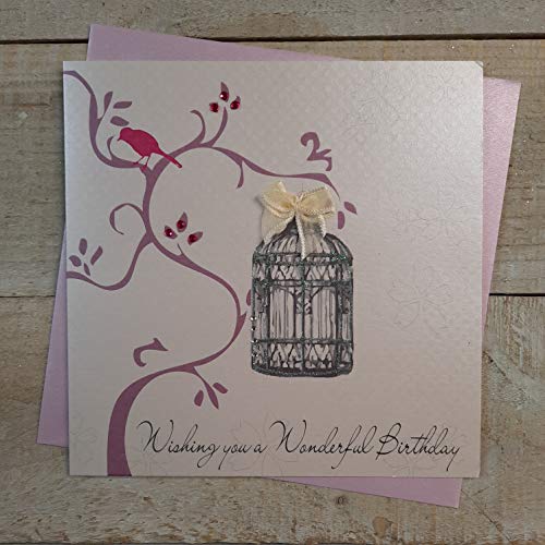 vita bomullskort 1 styck Wishing You a Wonderful Birthday handgjort kort, vintage fågelbur i träd