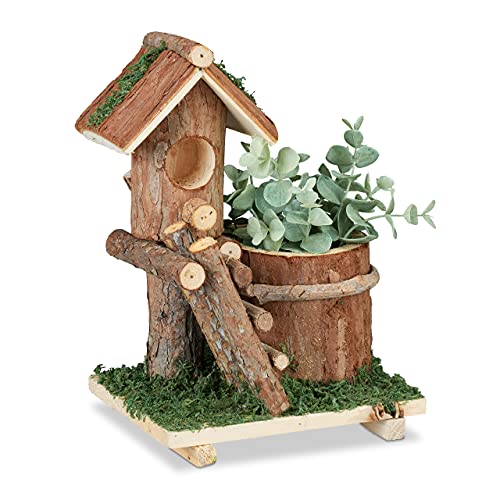 Relaxdays Blomkruka i trä, mini deco fågelholk och mossa, trädstam blomkruka design, rustik, inomhus- och utomhusbruk, trä, brun, 1 styck