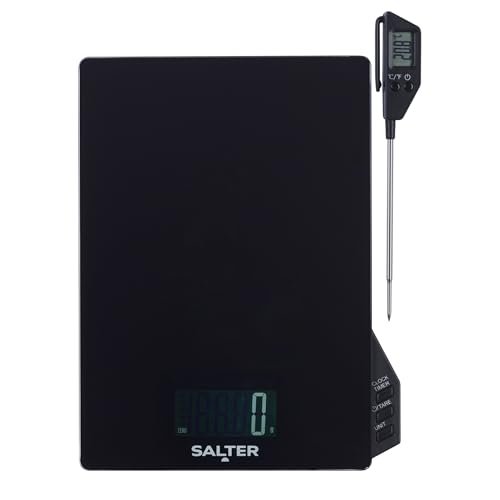 Salter Termometer och skalset – inbyggd timer och klocka, avtagbar termometer-sond, vattenmätare för mätning av vätskor, Celsius/Fahrenheit, flera mätningar, LCD-skärm, upp till 5 kg, SA00617FEU12