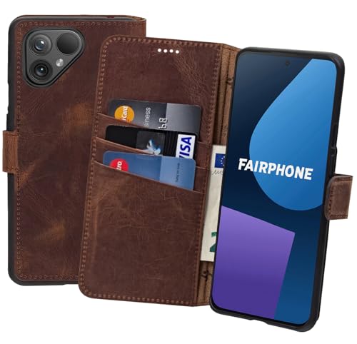 Suncase Book-Style fodral kompatibelt med Fairphone 5 läderfodral (smal fit) läderfodral mobilväska skyddsfodral med 3 kortfack i antikt kaffe