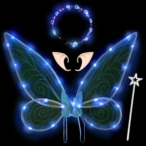 YOUYIKE Älvingar lysande LED, Fairy Wings vuxna och barnkostym med elfenöron blomkrans stjärnor, älvstänger, fjärilvingar, vuxna, älvor, fjärilvingar, kvinnor, älva, kostym