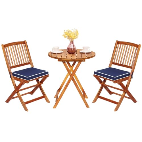 GIANTEX Bistrouppsättning med 3 delar, fällbara bord, terrass och stolar i akaciaträ med 2 avtagbara vadderade kuddar, utemöbler för uteplats trädgård veranda balkong (mörkblå)