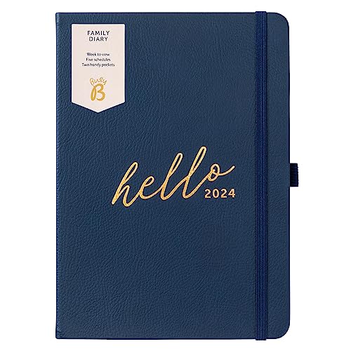Busy B – familjekalender från januari till december 2024 – marinblå – konstläder A5 veckoöversikt möteskalender, med 5 mötesplanerare och avrivslistor