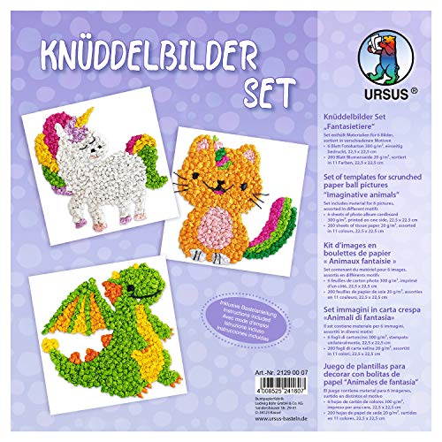 Knytbilder set fantasidjur, 6 ark fotokartong 300 g/m², ca 22,5 x 22,5 cm tryck på ena sidan, 200 blad blomsiden sorterade i 11 olika färger, inklusive pysselinstruktioner