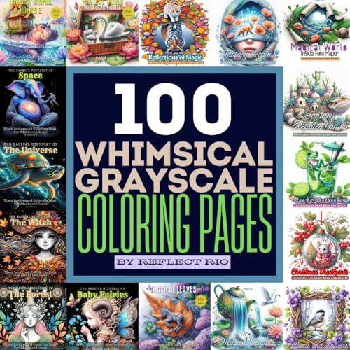 100 Whimsical Grayscale Coloring Pages: A Stunning Collection by Reflect Rio Featuring Fantasy, Nature, and Animals for Adults