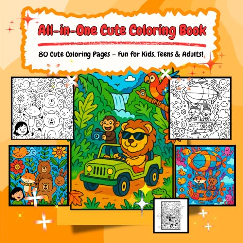 All in One Cute Coloring Book: 80 Fun Designs with Dinosaurs, Pirates, Fantasy Animals, Rainy Days & More – For Kids, Teens & Adults