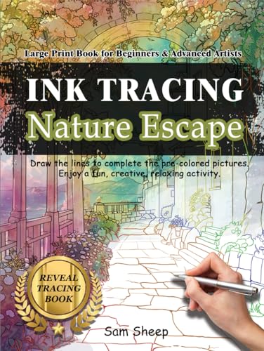 Nature Escape_Ink Tracing Book for Adults, Teens, Women and Men. The pages are pre-colored, Follow the White Lines to Reveal Artworks: A New Concept ... Calmness, Meditation Fantasy landscape