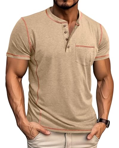 LAOARA T-shirt för män, kortärmad farfarströja, tunisisk krage, lätt vikt, med knappar, storlek M–3XL, kaki, XL