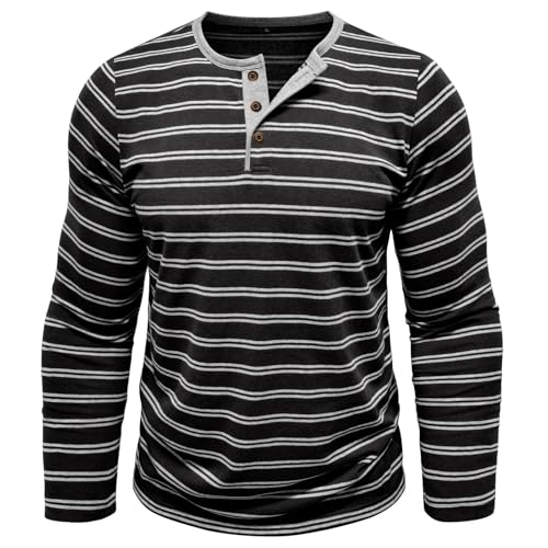 MakingDa Henley-skjortor för män långärmade kontrastränder knappar Henley hals pullover farfarströja normal passform andningsbar hållbar mjuk lätt vardaglig klassiska toppar, Svart, XL