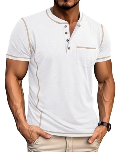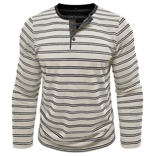 MakingDa Henley-skjortor för män långärmade kontrastränder knappar Henley hals pullover farfarströja normal passform andningsbar hållbar mjuk lätt vardaglig klassiska toppar, Vitt, XL