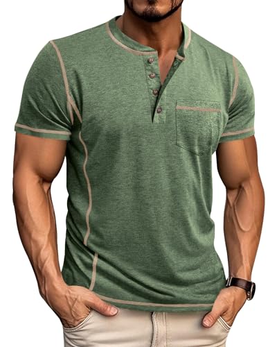 MakingDa Henley-skjortor för män långärmad knapp vintage solid golf normal passform farfarströja vardaglig klassisk mjuk andningsbar lätt arbetskläder gym smarta toppar, gRÖN, XL