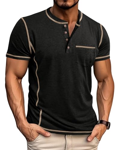 LAOARA T-shirt för män, kortärmad farfarströja, tunisisk krage, lätt vikt, med knappar, storlek M–3XL, svart, M