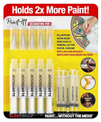 Slobproof Paint It! Dekorationspennor, påfyllningsbara färgpennor, fin spets, hem, hobbyer, hantverk, scrapbooking, fyllning med krita, glitter och metallisk färg, fungerar på trä, tyg, metall, 5-pack