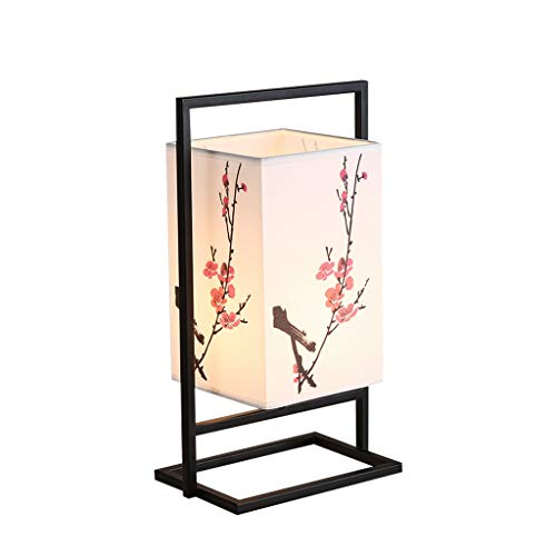 Nattduksbordslampa för japanska sovrum, modern asiatisk bordslampa med svart metallram, kubisk tygskärm – mjukt ljus som är perfekt för att ha bredvid sängen, på/av-knapp (färg: Plommonblomma)