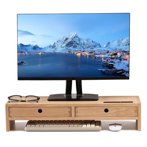KIRIGEN Träskärmsstativ med 2 lådor stationär dator förvaring organisatör TV-högtalare bärbar dator skrivarhållare skrivbord skrivbord stativ naturlig färg