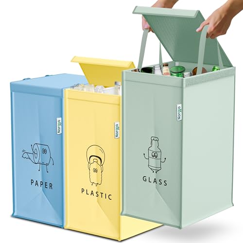 NORGGO® Återvinningskärl – Set med 3 x 40L för plast, papper och glas – Hållbara soptunnor för återvinning – Färgade soppåsar – Återvinningsbehållare med 3 fack